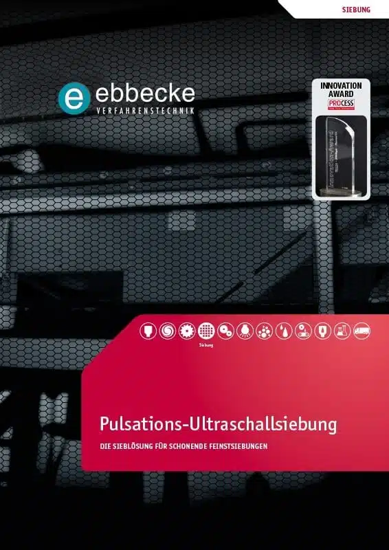 Das von der Ebbecke Verfahrenstechnik AG entwickelte Pulsationsverfahren in Kombination mit einer speziell konstruierten Plansichter-Siebanlage ermöglicht die schonende Lohnsiebung selbst siebschwieriger Feinstpulver. Kornzerstörungen, wie sie bei herkömmlichen Ultraschallverfahren vor allem bei plättchenförmigen Pulvern auftreten, werden deutlich reduziert. Die Anlage mit geschlossener Dosier-Vibrationsrinne erlaubt eine stufenlose Einstellung von Neigung, Drehzahl der Planerregung und Intensität der Ultraschallpulsation.